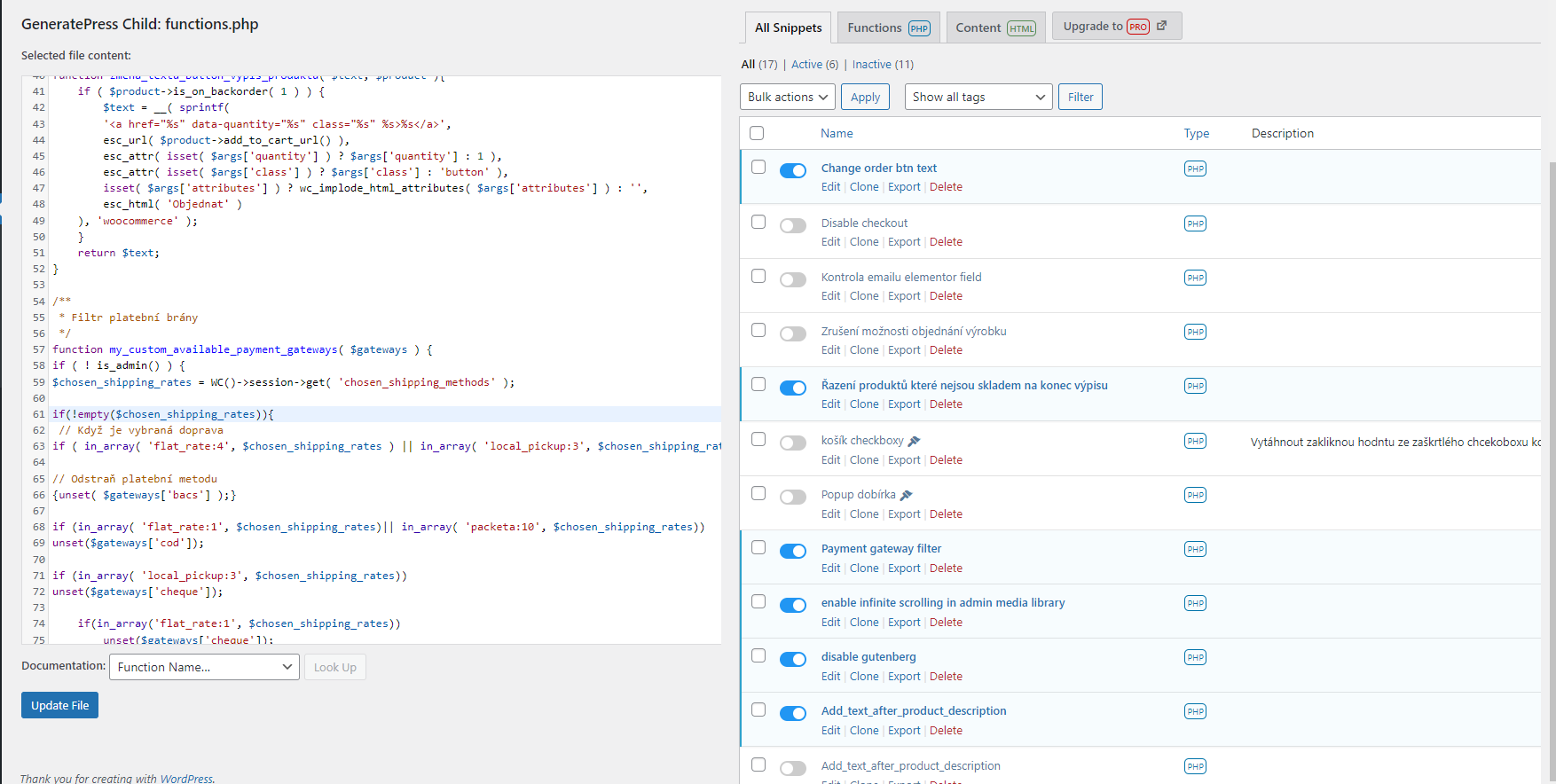 Pro lajka který se nebojí kódu je vhodný plugin pro správu snippetů. Snippety jsou krátké kousky kódu, které zajišťují nějakou funkcionalitu. Standardně se zapisují přímo do šablony a pokud nemáte takzvanou „Child Theme“, tak se vám kódy po každé aktualizaci šablony smažou. Navíc když se na webu něco rozbije tak je mnohem jednodušší deaktivovat celý plugin jedním klikem a v případě že se vada po deaktivaci neprojeví, lze v pluginu jednotlivé snippety vypínat. Není potřeba hledat kde končí kód jednoho snippetu a kde už začíná druhý.