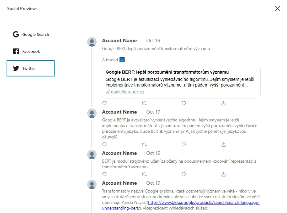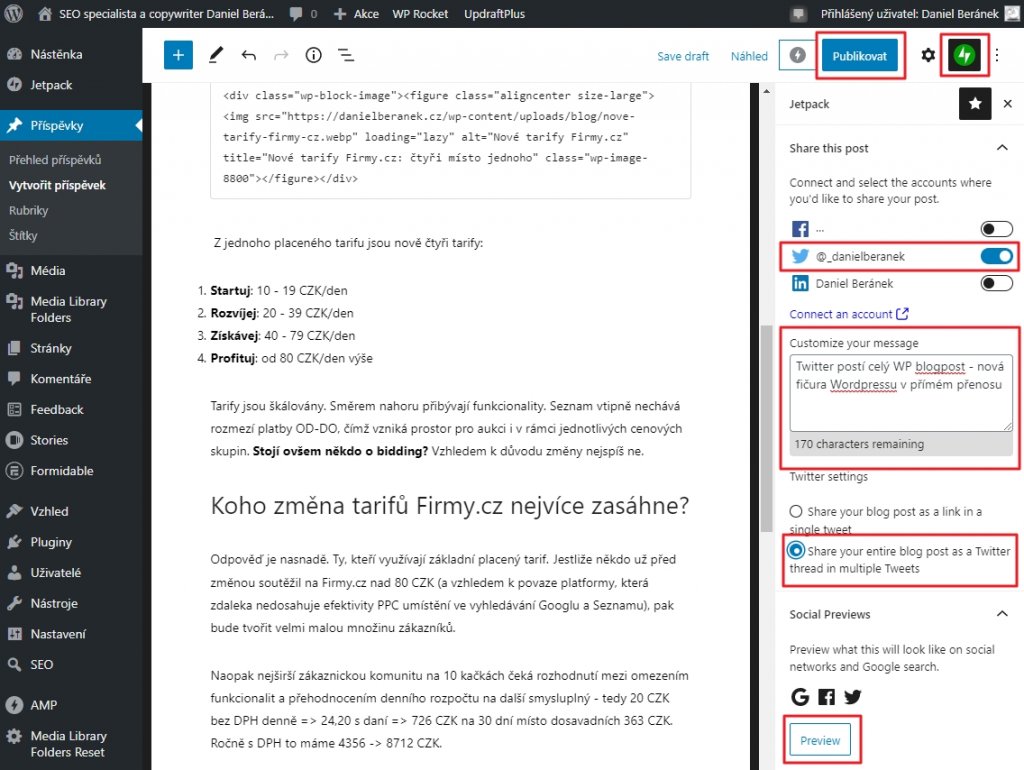 WordPress navíc uživatelům usnadní i přípravu obsahu přímo v rozhraní CMS. V rámci náhledu Social Previews (plugin Jetpack) je možné se podívat, jak bude aktuálně připravovaný text včetně médií vypadat rozpublikovaný do příspěvků vlákna na Twitteru.
