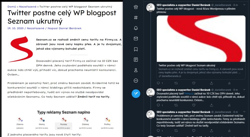 „Odsdílejte celý wordpressový blogpost jako vlákno na Twitteru. Každé slovíčko, fotku a video. Vše se rovnou přenese na sociální síť. Nikdy nebylo snazší nakopnout dosah a zapojení publika obsahu za hranicemi WordPressu,“ uvádí funkci WordPress.