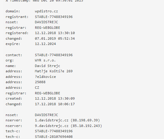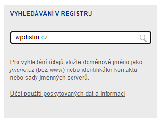 Po odeslání dotazu se Vám zobrazí výpis dostupných informací o doméně, kde kromě držitele (proklikem na něj zjistíte detailnější informace) doménu můžete zjistit i informace jako jsou: