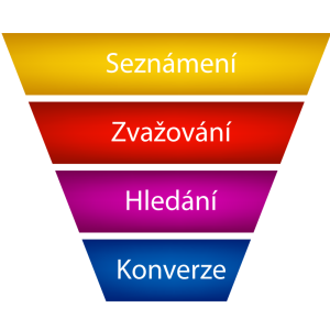 Vše začíná u budování povědomí o nabízeném produktu/službě. Někteří lidé, kteří už se s Vaší firmou seznámili, přechází do další úrovně trychtýře, kdy o nabídce uvažují. Následuje úroveň hledání, kdy se potenciální zákazník informuje detailněji o vaši nabídce a případně ji porovnává s konkurencí. Poslední úrovní je pak samozřejmě cílová konverze.