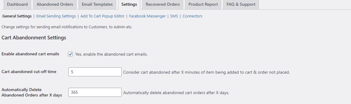 1. Zaškrtnout checkbox „Enable abandoned cart emails“ ve WooCommerce -> Abandoned Carts -> Settings -> General Settings -> první checkbox