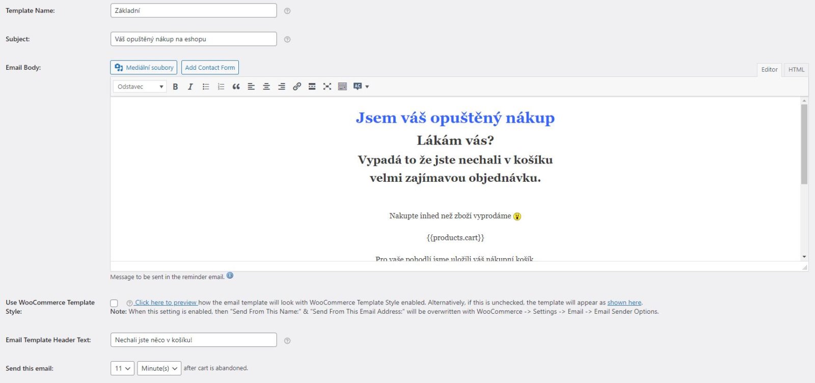 U druhého kroku lze e-mailovou šablonu rozkliknout (tlačítko edit) a s využitím WYSIWYG editoru (tedy bez znalosti HTML kódu) ji nastylovat a sepsat obsah, navíc můžete zaškrtnout generování unikátního kódu pro každý opuštěný košík. Svoji práci můžete během vteřin zkontrolovat pomocí odeslání testovacího emailu.